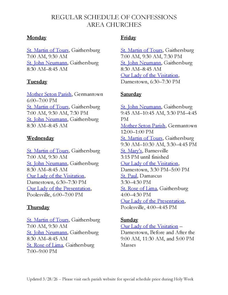 Below the Holy Week Schedule, you will find a list of regular times that confessions are heard at our surrounding parishes. Please check their websites for the special times offered during Holy Week. His mercy endures forever!