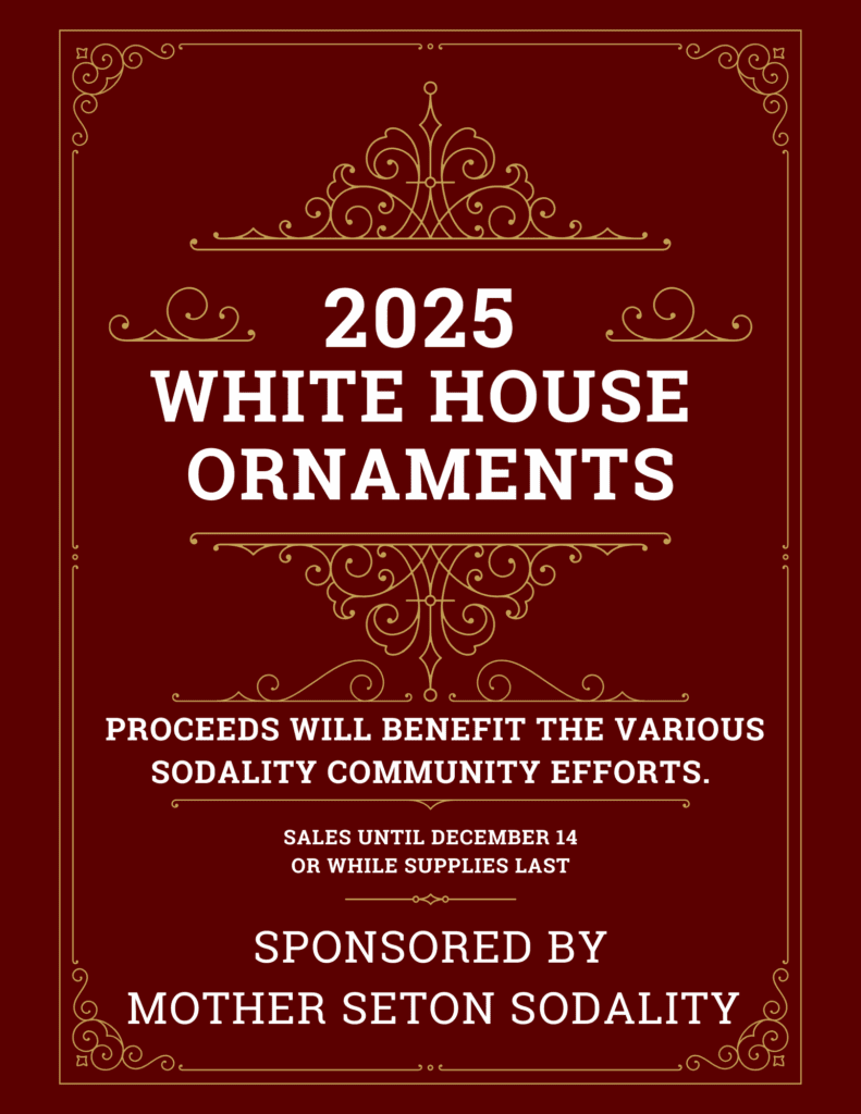 Sodality will be selling their 2025 White House Ornaments starting this weekend after all the Masses. Proceeds will benefit the various Mother Seton Sodality community efforts!