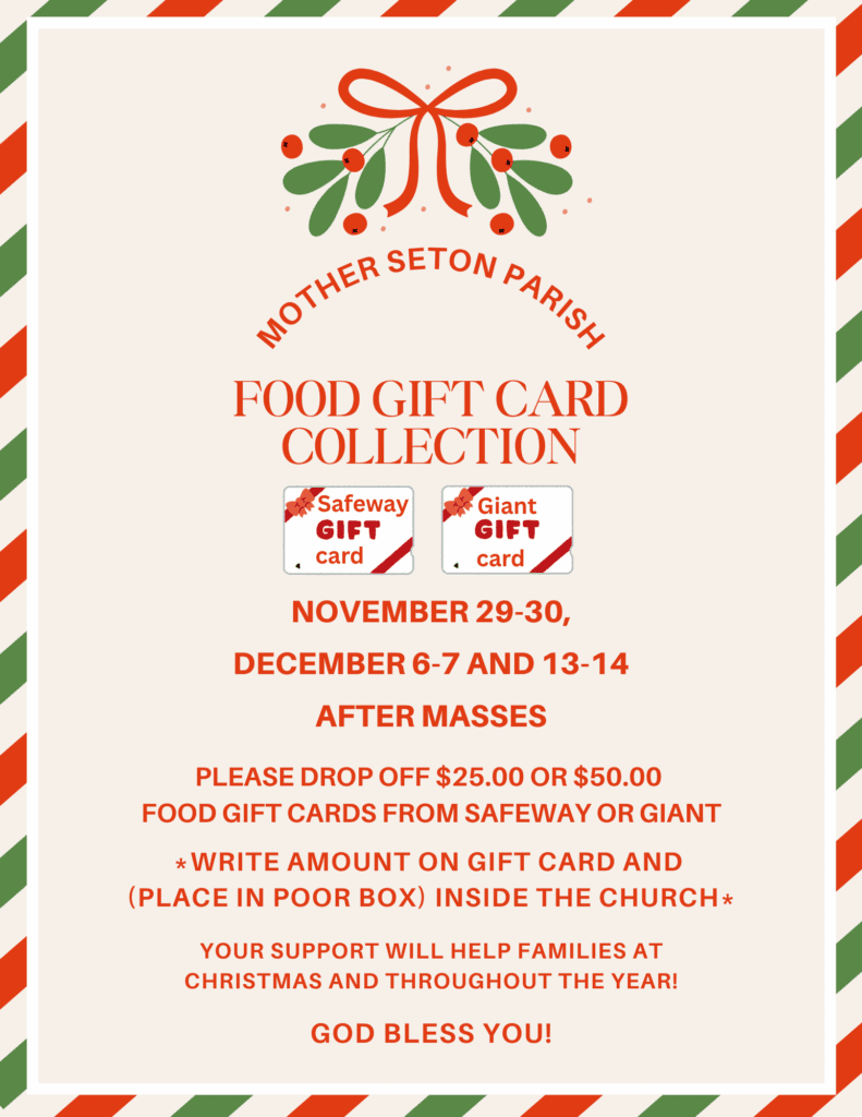 We are collecting $25-$50 food gift cards from Safeway and Giant to help families struggling this holiday season after the weekend Masses: