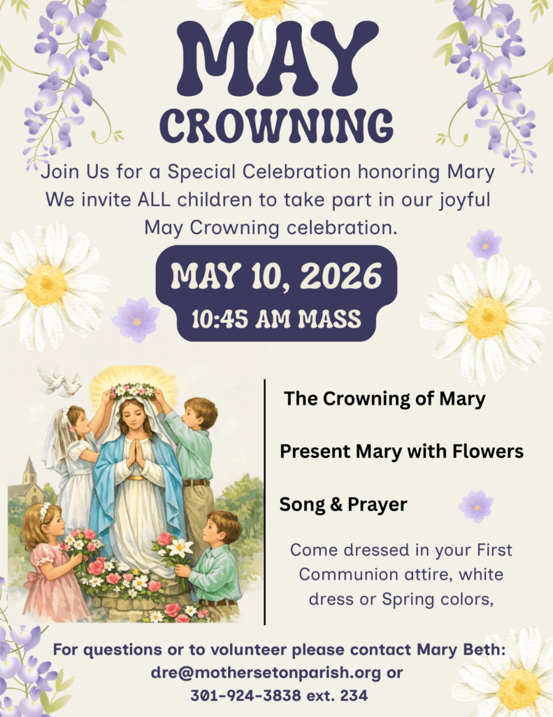 For questions or to volunteer please contact Mary Beth – dre@mothersetonparish.org or 301 924 3838 ext. 234